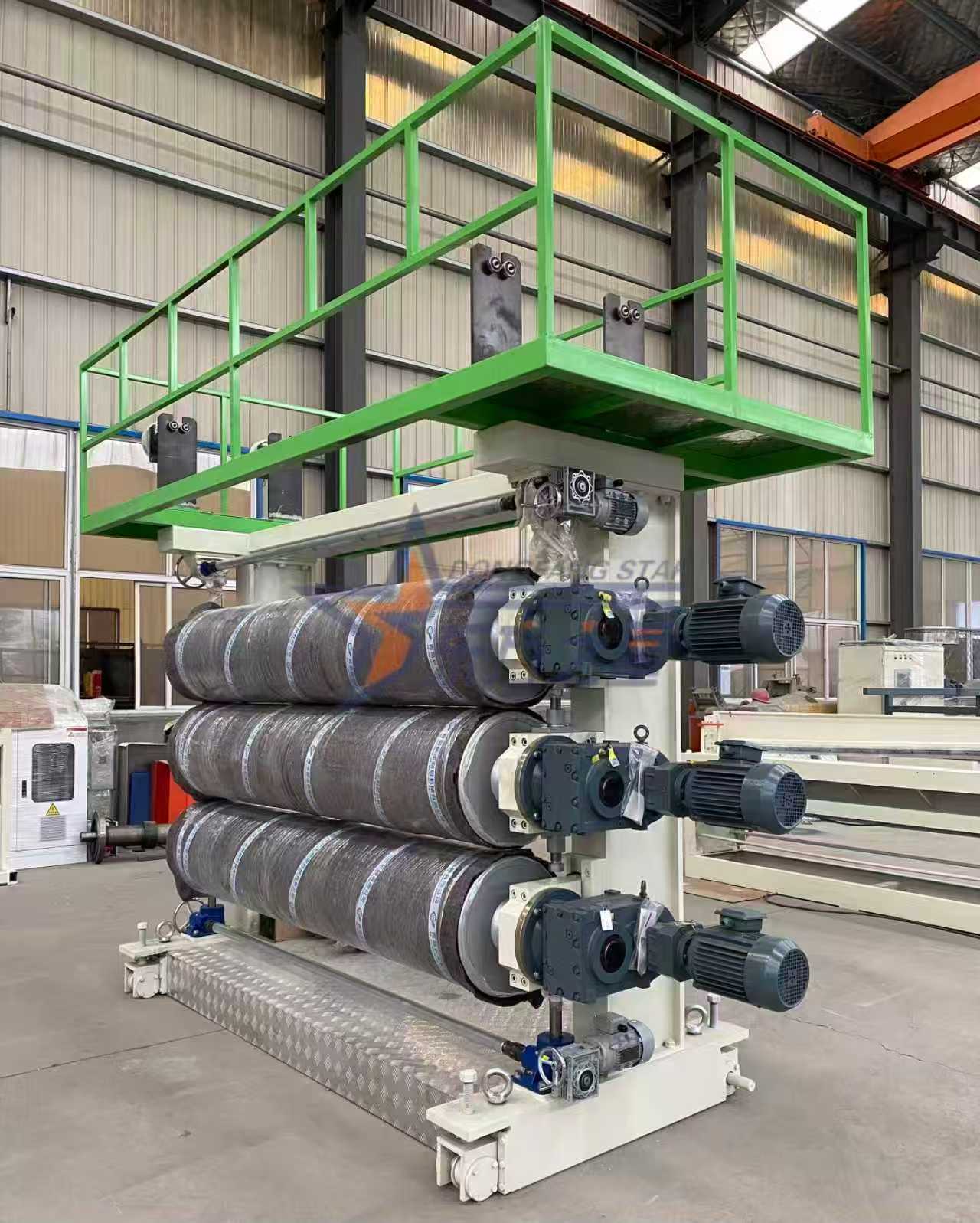 দABS/HIPS শীট উৎপাদন লাইনABS, HIPS-এর মতো আর্দ্রতা-সংবেদনশীল উপকরণগুলিকে রক্ষা করার জন্য একটি শুষ্ক মিক্সার এবং একটি ভ্যাকুয়াম ড্রায়ার সহ একটি কেন্দ্রীভূত শুকানোর ব্যবস্থাও রয়েছে। চাদরগুলি ছাড়ার আগে পুঙ্খানুপুঙ্খভাবে শুকানো হয়। তিনটি রোলার সুনির্দিষ্ট বেধ নিয়ন্ত্রণ এবং পৃষ্ঠ চিকিত্সা নিশ্চিত করে। চাপার পরে, শীটগুলিকে 26টি স্টেইনলেস স্টিলের রোলার সহ একটি 8-মিটার দীর্ঘ কুলিং ফ্রেমে ঠান্ডা করা হয় এবং তারপরে ট্র্যাকশন মেশিনের মাধ্যমে পরিবাহিত করা হয়। সমগ্রABS/HIPS শীট সরঞ্জামtসম্পূর্ণরূপে উচ্চ-মানের নাইট্রাইডেড ইস্পাত 38CrMoAlA ইস্পাত দিয়ে তৈরি এবং এটি একটি ABB ফ্রিকোয়েন্সি কনভার্টার দিয়ে সজ্জিত, যা এই দুটি কাঁচামালের আউটপুট 400-600 kg/h এ পৌঁছাতে দেয়৷
